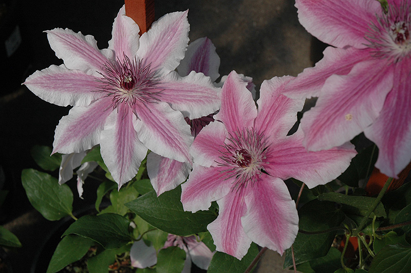 A stunning vine producing elegant white flowers with exquisite pink stripes on the petals; great for covering fences or arbors