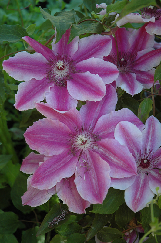 Carnaby Clematis is covered in stunning white star-shaped flowers with pink stripes at the ends of the branches from early summer to early fall. It has green deciduous foliage. The compound leaves do not develop any appreciable fall colour.