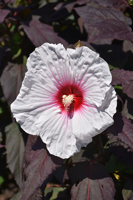 Showy, gigantic, ruffled white flowers have a pink cast, with cherry red eyes, and dark pink veins; the flowers really make a bold statement when contrasted by the deep burgundy to near-black foliage; do not allow to dry to wilting point