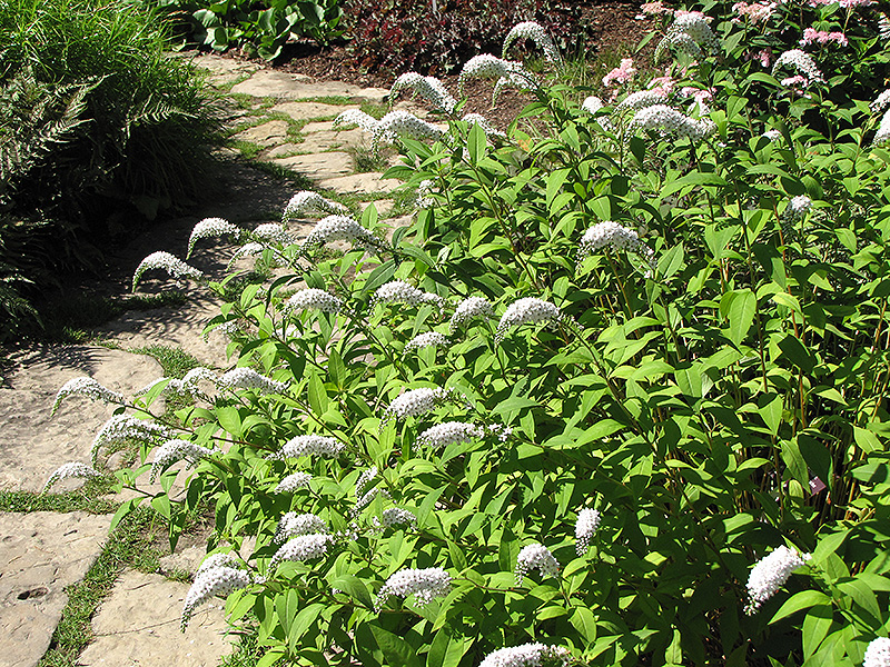 Gooseneck Loosestrife will grow to be about 3 feet tall at maturity, with a spread of 3 feet. When grown in masses or used as a bedding plant, individual plants should be spaced approximately 24 inches apart. It tends to be leggy, with a typical clearance of 1 foot from the ground, and should be underplanted with lower-growing perennials. It grows at a fast rate, and under ideal conditions can be expected to live for approximately 10 years. As an herbaceous perennial, this plant will usually die back to the crown each winter, and will regrow from the base each spring. Be careful not to disturb the crown in late winter when it may not be readily seen!
