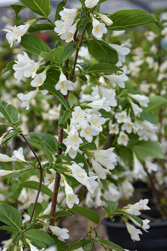 April Snow Weigela is covered in stunning clusters of white trumpet-shaped flowers along the branches in mid spring. It has dark green deciduous foliage. The pointy leaves do not develop any appreciable fall colour.