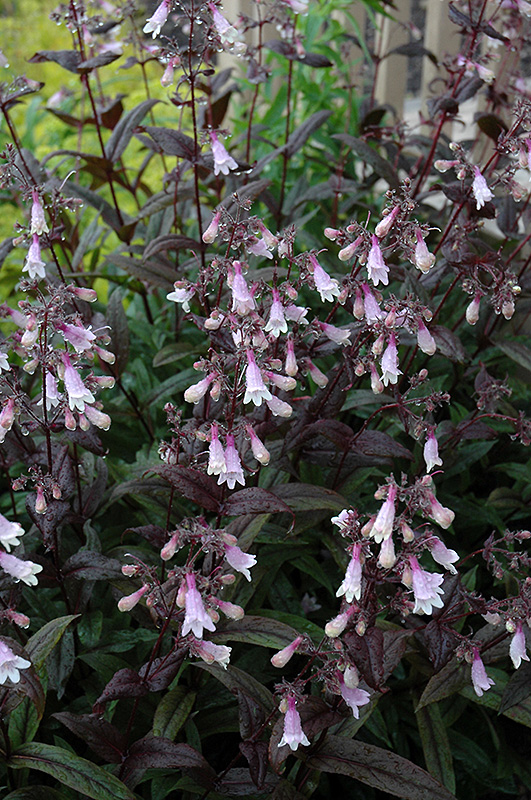 Dark Towers Beard Tongue has masses of beautiful spikes of white tubular flowers with a pink reverse rising above the foliage from early to mid summer, which emerge from distinctive violet flower buds, and which are most effective when planted in groupings. The flowers are excellent for cutting. Its attractive glossy narrow leaves emerge burgundy in spring, turning dark green in colour with distinctive deep purple edges. The foliage often turns brown in fall. The deep purple stems are very colorful and add to the overall interest of the plant.