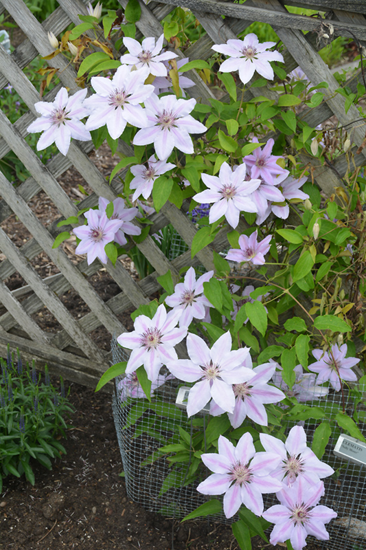 An old fashioned favorite that never seems to go out of style, this flashy climber features enormous lavender flowers with prominent hot pink bars down each petal; a real showstopper for the garden